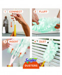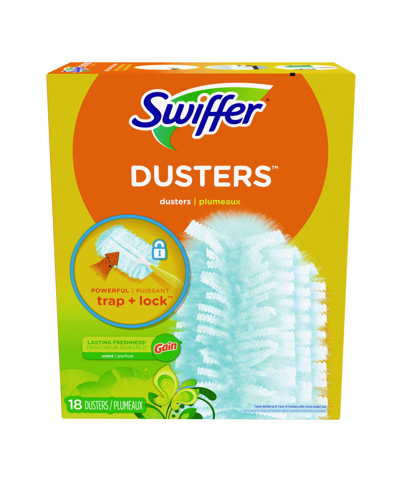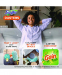 Swiffer Dusters TRAP + LOCK dust wherever dust shows up, including fan blades, blinds, car interior, keyboard vents, bookcases, and more. They are made with specially coated fibers that grab onto dust and don't let go. Enjoy the lasting freshness of Gain as you clean. Leaves behind up to one hour of freshness after initial product use.