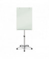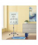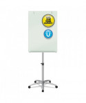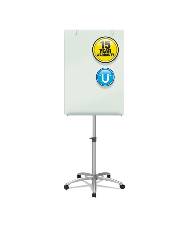 Magnetic glass board easel is a modern twist on the traditional presentation easel. The white glass marker board surface is made of tempered glass, making it easy to clean and exceptionally durable. Glass surface will not stain, ghost, scratch or dent and is suitable for heavy duty use. Large, frameless, 3' x 2' glass surface is durable and its magnetic quality allows it to double as a bulletin board. Flipchart holder securely holds a standard size flipchart pad. Easel has a 5-caster base for mobility throughout the office. Height adjustable from 67" to 77" for added convenience. Included accessory tray for markers and other, small useful items. Silver easel is a sleek, subtle choice for modern work environments.