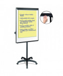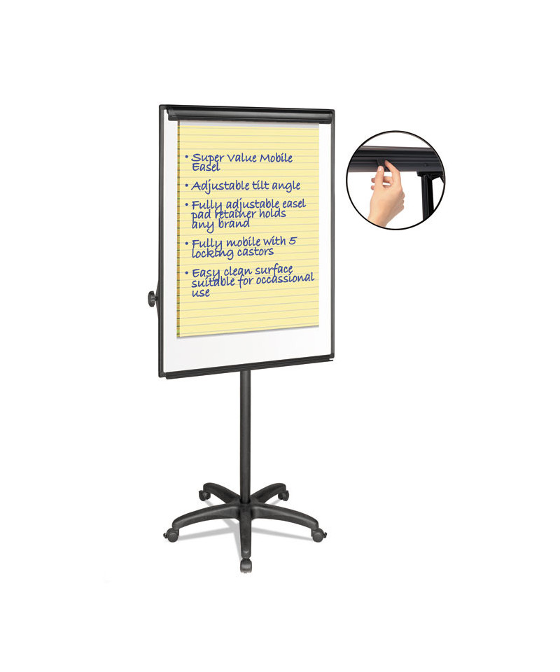 This basic mobile easel allows you the versatility of mobility at a genuine value. The lacquered magnetic steel surface is ideal for frequent use. The board tilts for comfort, and the no-pinch patented pad retainer is fully adjustable and will hold any size or brand pad. This is constructed with an aluminum frame.