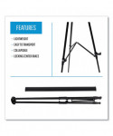 The Lightweight Telescoping Display Easel is ideal for holding signs, boards or easel pads. The telescoping aluminum legs have an adjustable height. The adjustable display support brackets, locking center brace and non-skid feet ensure that your item is always securely posed. The heavy duty display easel is able to support up to 25 lbs. The patented no-pinch pad retainer is included, and features an easy snap-in or out clip, so it can be added or removed with ease.