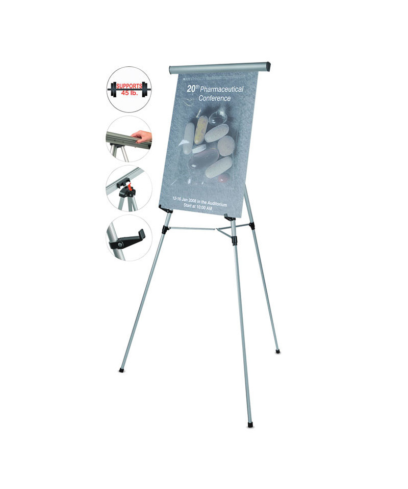 The Lightweight Telescoping Display Easel is ideal for holding signs, boards or easel pads. The telescoping aluminum legs have an adjustable height. The adjustable display support brackets, locking center brace and non-skid feet ensure that your item is always securely posed. The heavy duty display easel is able to support up to 25 lbs. The patented no-pinch pad retainer is included, and features an easy snap-in or out clip, so it can be added or removed with ease.