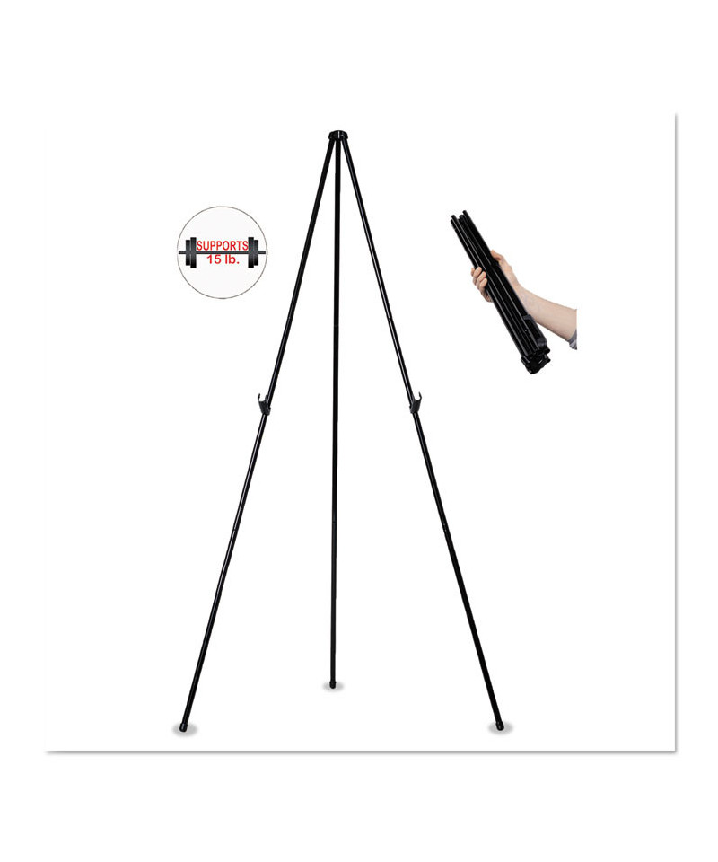 The MasterVision™ Instant Display Easel is ideal for holding signs or boards and has a sturdy display capacity. This portable display solution is perfect for trade shows or sales calls; anywhere transport is necessary. The adjustable support brackets and non-skid feet ensure that your item is always securely posed. The easel easily extends and locks to its full height for quick presentation set-ups; and when not in use, it can quickly collapse down to a compact size that's small enough to fit into most briefcases and bags