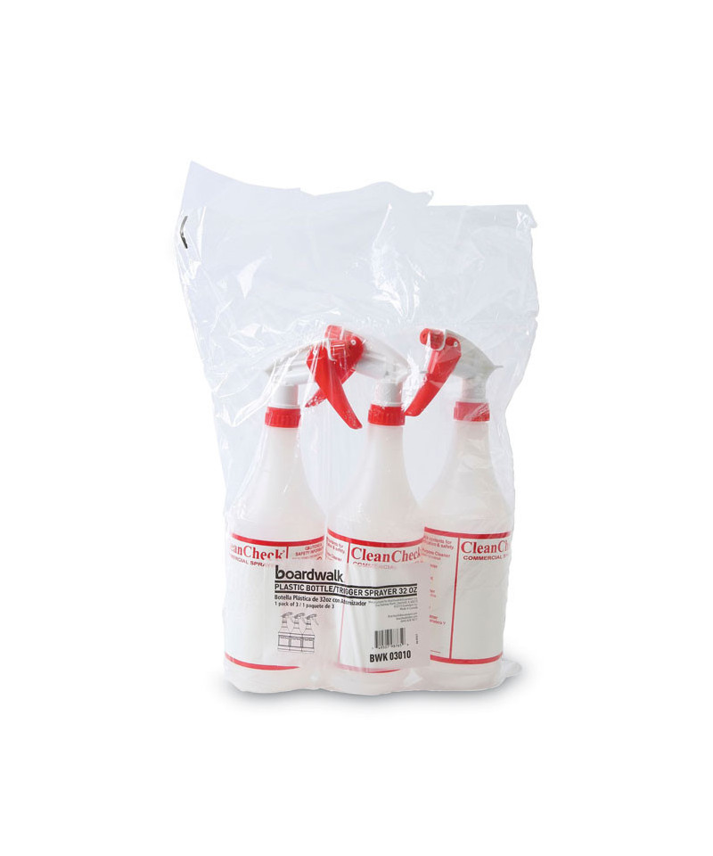 Sturdy spray bottles are an excellent choice for everyday and industrial cleaning needs. Pre-printed bottles with bilingual content (English and Spanish) make it easy identify contents and measure cleaning solutions. Bottles are imprinted with ultraviolet ink for superior chemical resistance and a bright, glossy finish. Great for restroom cleaning, housekeeping, window cleaning, car washes, auto detailing, pest control, and lawn care.
