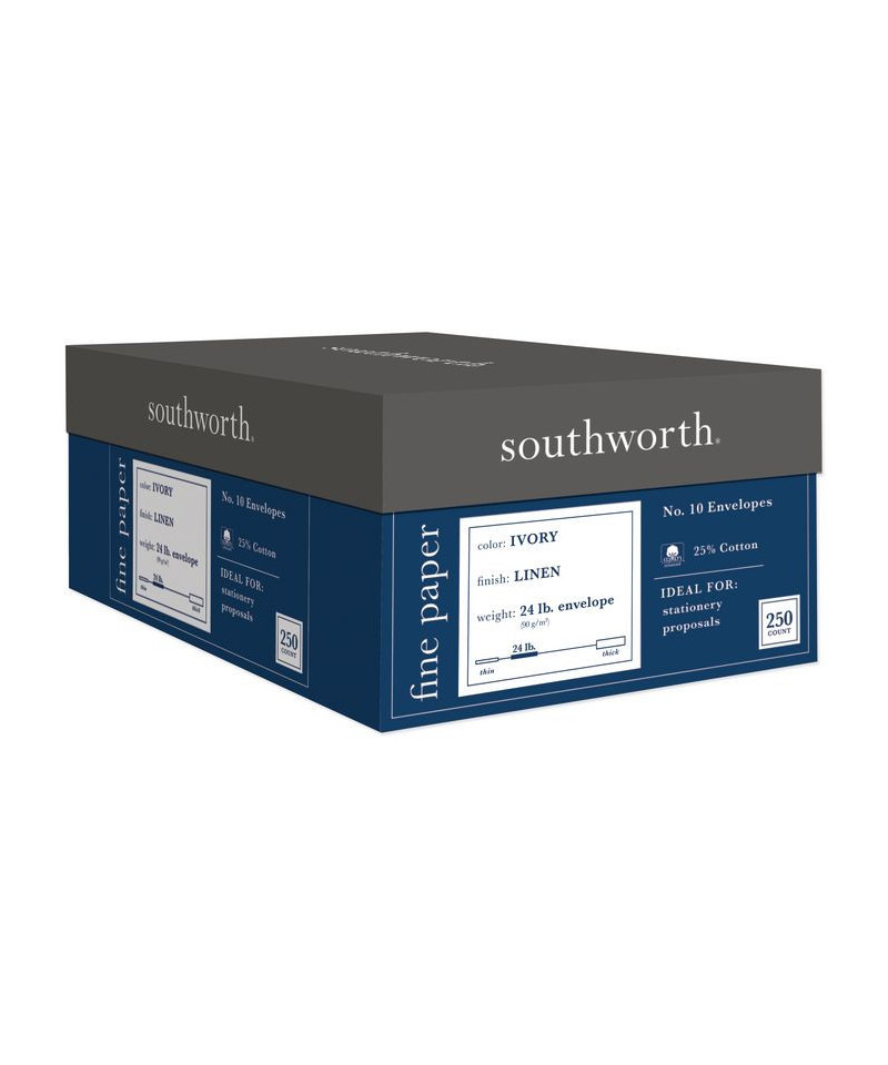 Make a professional first impression with fine, coordinated stationery. Rich, linen-cotton stock lends an element of elegance to any correspondence. Compatible with inkjet and laser printers and copiers. Gummed flap. The Southworth® collection of business papers is truly among the finest papers available for professional offices of any size. Communicate in style. From the first moment to enduring memory, cotton paper adds a touch of class, making first impressions more impressive with a distinct crispness and an unmistakable feel. Someone picking up your document will know before they even read a single word that there's something special to it. Cotton fiber also provides archival durability – it's the reason so many historic documents are still with us even centuries later.