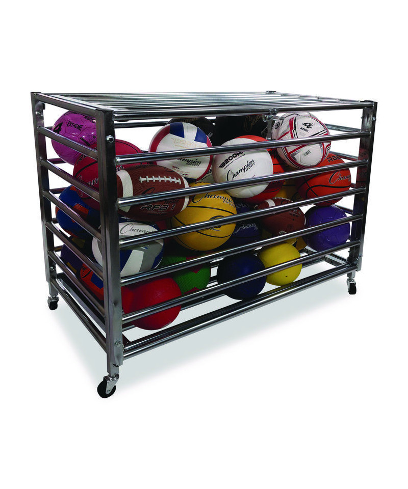 The Champion Sports Heavy Duty Lockable Ball Storage Locker holds up to 30 various basketball balls, soccer balls or playground balls. This ball locker features all welded galvanized steel tubing to ensure your items are safe, a high-polished finish for increased indoor and outdoor durability, and non-marring casters that not only protect the finish of your play surface but also allow for convenient transport of equipment.