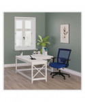 Stylish, L-shaped, farmhouse desk with X accents on side panels. The multi-function desk is constructed with a smooth, laminate wood top and white wood legs. The simple design without drawers fits conveniently into a corner to maximize space. Wide tabletop surfaces provide ample space to work and display organizational or decorative items. The open design has a light, airy feel, and coordinates with most décor. Some assembly is required.