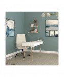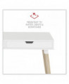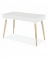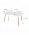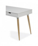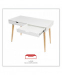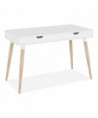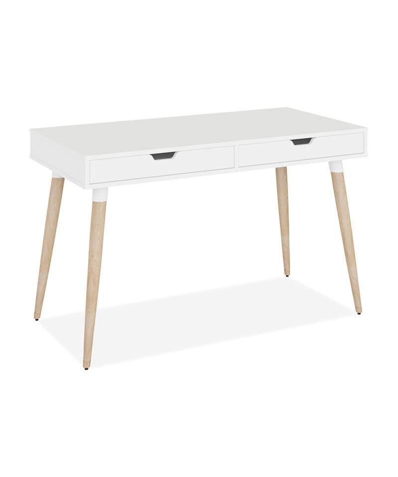 Scandinavian writing desk is a simple and modern working desk that's ideal for working or studying. The multi-function desk is constructed with a durable, white laminate top and beige wood-colored, angled, wood legs. The wide, smooth work surface allows you to manage multiple tasks at once such as working on a computer and taking notes. The desk includes two large, glided drawers which provide optimal storage. Designed with a clean look that takes up minimal space on the floor and fits the décor of most spaces. Some assembly is required.