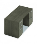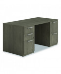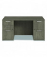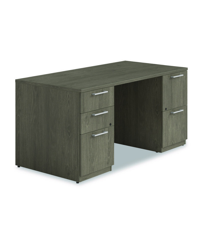 A thoughtfully designed piece that offers both functionality and style for any office environment. Equipped with two pedestals, this desk maximizes storage space to keep your workspace organized and clutter-free. These drawers offer versatile storage solutions for your office supplies, files, and personal items, allowing you to access what you need with ease. The double-pedestal design offers sturdy support, while the laser edge band construction enhances durability for long-lasting use. Crafted from particleboard, the desk is finished with a rich laminate and thermofused melamine (TFM), combining both strength and aesthetics. The premium laminate is resistant to burns and impacts, making this desk ideal for a high-traffic office setting. Its surface is designed to withstand the daily wear and tear of a busy work environment, ensuring that it maintains its sleek appearance over time. To enhance functionality, the desk includes two grommets for convenient cable management, allowing you to keep wires and cords organized and out of the way. Additionally, adjustable glides provide stability on uneven flooring, ensuring a level surface no matter where the desk is placed.