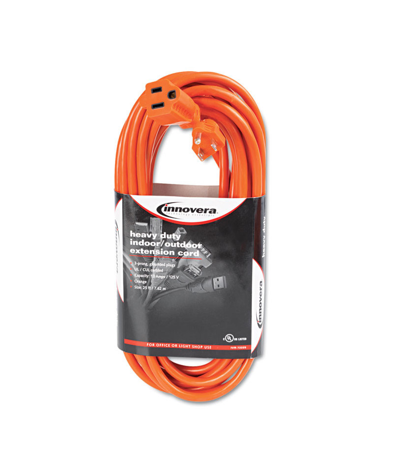 Power up your workspace with the Innovera® indoor/outdoor heavy-duty extension cord. This grounded, cord delivers robust 13 A/120 V performance. Best for garage, shop or light industrial use. Rugged yet managable design offers a reliable and compliant solution. Dependable addition to any indoor or outdoor environment. Bright color stands out for safety.
