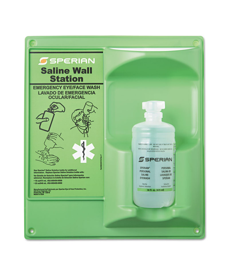 Wall-mountable saline solution kit allows immediate eye flushing until the injured person can be helped to a primary eyewash device. Brightly colored station is highly visible. Instructions in English and Spanish facilitate use in an emergency. Integral overhang protects bottles from dust and debris. Eyewash station is readily available at times when swift assistance is vital.