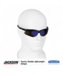 Sleek, flexible, lightweight design with soft-touch temples for comfort. Patented nose piece designed to be extremely flexible, to channel sweat away from the eyes, and to help prevent slippage down the nose—all for long-term comfort. Scratch-resistant dual polycarbonate lens offers 99% UVA/UVB/UVC protection.