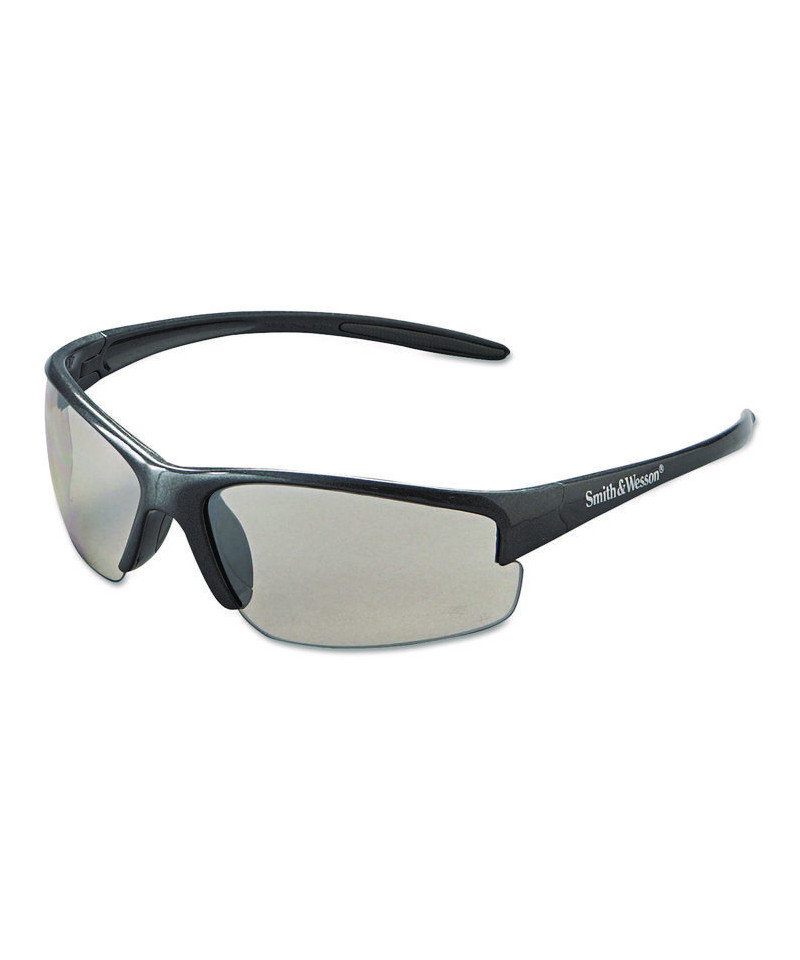 Stylish safety glasses have a modern, cutting edge design. Soft, rubber nose pads for superior comfort and fit. Dual lenses with an 8-base curve offer wraparound protection. Sport-grip temples eliminate slippage and help glasses sit comfortably. High performance polycarbonate lenses provide 99.9% UV protection. Safety eyewear meets ANSI Z87.1+ impact standard.