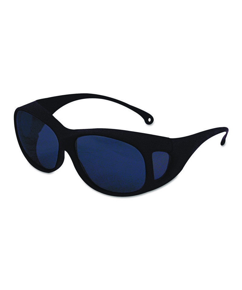 Stylish safety eyewear is designed to fit over most prescription eyeglasses. Integral side shields offer increased protection. Lenses offer 99% UV protection.