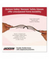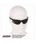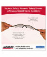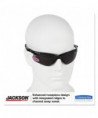 Safety eyewear with integral diopters for vision assistance allows clearer vision. Larger wraparound lenses cover more area for increased safety. Precise placement of diopter insert creates distortion-free visibility. Enhanced nose piece design features integrated ridges to channel sweat for a more comfortable experience. Lenses provides 99.9% UV protection.