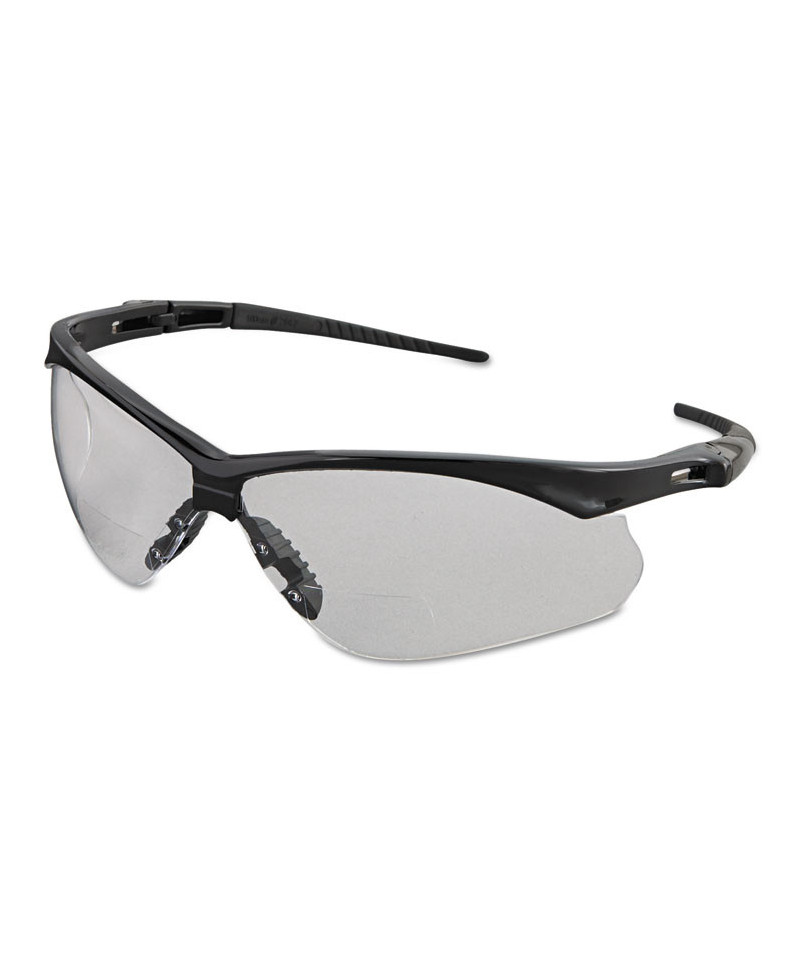 Safety eyewear with integral diopters for vision assistance allows clearer vision. Larger wraparound lenses cover more area for increased safety. Precise placement of diopter insert creates distortion-free visibility. Enhanced nose piece design features integrated ridges to channel sweat for a more comfortable experience. Lenses provides 99.9% UV protection.