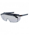 Over-the-Glasses (OTG) wraparound lens for a wide field of vision and seamless fit over prescription frames. These safety glasses feature polycarbonate lenses to protect against impacts and filter 99.9 percent of harmful UVA, UVB and UVC rays. The frame features a nylon and soft rubber design for added durability and flexibility, while a molded-in brow guard and side shields provide enhanced protection from debris. Integrated brow venting enables airflow for all-day comfort. To provide a custom, secure fit on a variety of faces, the rubber temples can be easily bent and re-bent. Built-in soft rubber guards on the frame and temples protect prescription frames and lenses from constant movement and harmful scratching that can occur with some over-the-glasses safety glasses.
