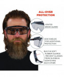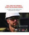 Skullerz OSMIN Safety Glasses feature an Over-the-Glasses (OTG) wraparound lens for a wide field of vision and seamless fit over prescription frames. These safety glasses feature polycarbonate lenses to protect against impacts and filter 99.9 percent of harmful UVA, UVB and UVC rays. The frame features a nylon and soft rubber design for added durability and flexibility, while a molded-in brow guard and side shields provide enhanced protection from debris. Integrated brow venting enables airflow for all-day comfort. To provide a custom, secure fit on a variety of faces, the rubber temples can be easily bent and re-bent. Built-in soft rubber guards on the frame and temples protect prescription frames and lenses from constant movement and harmful scratching that can occur with some over-the-glasses safety glasses.