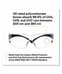 3M® Pressure Diffusion Technology allows temples to naturally adjust to individual head sizes, eliminating the need to stock multiple frame sizes at worksites. Secure, snug fit keeps eyewear in place without slippage even when the wearer is in motion. Anti-fog coating helps keep lenses free of moisture in hot and humid conditions. Polycarbonate lenses absorb 99.9% UVA and UVB up to 380 nm.