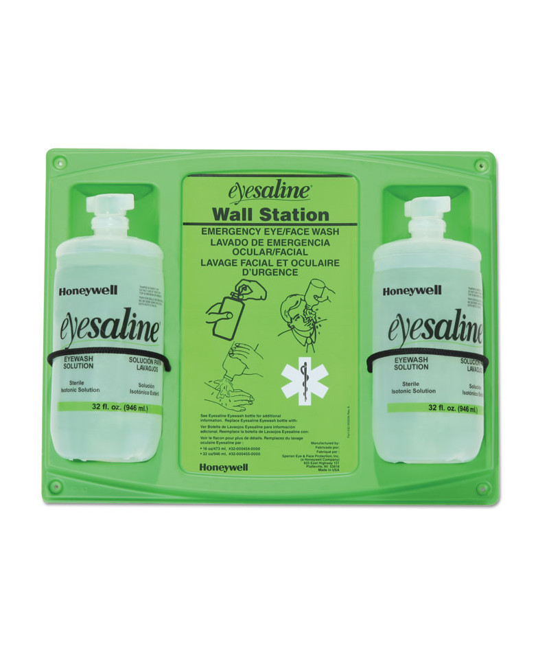 Wall-mountable saline solution kit allows immediate eye flushing until the injured person can be helped to a primary eyewash device. Brightly colored station is highly visible. Instructions in English and Spanish facilitate use in an emergency. Integral overhang protects bottles from dust and debris. Eyewash station is readily available at times when swift assistance is vital.