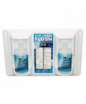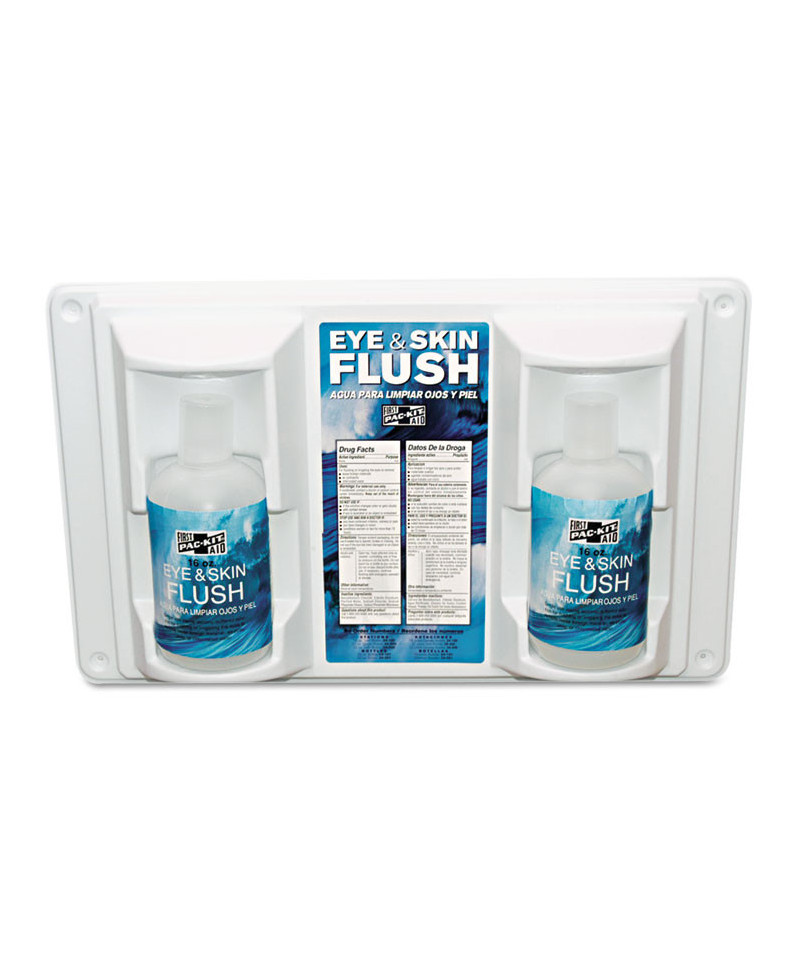 Eye wash station holds twin bottles of sterile, isotonic buffered solution for use in emergency situations. Station provides fast and easy access to two full-size 16-ounce bottles of solution. Place convenient wall-mountable stations where they are needed most. Eye wash stations fully stocked with sterile solution are a vital step in ensuring employee safety.