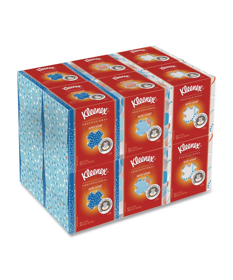More people choose Kleenex® Facial Tissue than any other brand, proving that all facial tissues are not created equal. Did you know that more than 90% of employees miss work each year due to "minor illnesses," such as cold and flu? Each Kleenex® Anti-Viral tissue has three soft layers, including a moisture-activated middle layer that kills 99.9% of cold and flu viruses in the tissue within 15 minutes. It's virucidal against Rhinoviruses Type 1A and 2 (rhinoviruses are the leading cause of the common cold), Influenza A and B (causes of the flu), Respiratory Syncytial Virus (RSV – the leading cause of lower respiratory infection in children). Each tissue features small blue dots on the interior layer, which signal they're anti-viral. Buy these in bulk, so you won't run out. Choosing Kleenex® lets everyone know that you care enough to provide the very best.