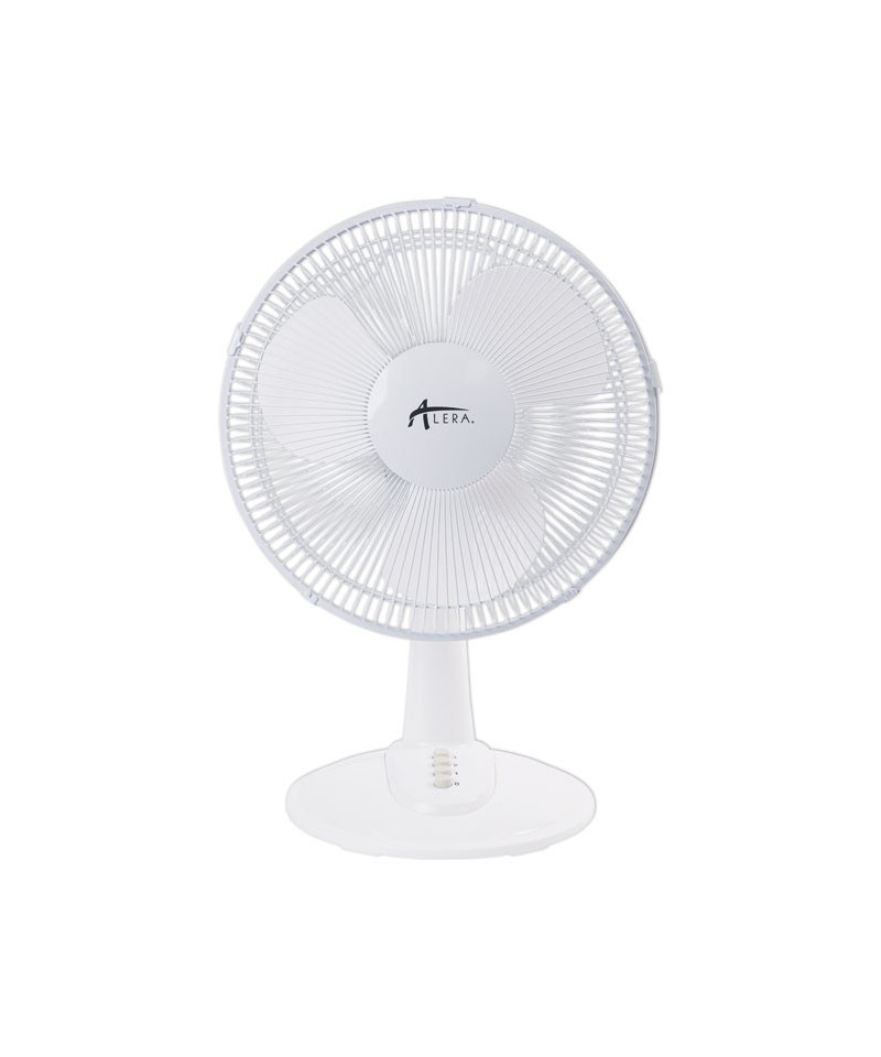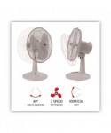 Oscillating fan provides smooth, cooling air flow. 12" diameter fan blades provide ample air circulation with minimal noise. Features three speed settings, oscillation on/off control and vertical tilt adjustability. 80° oscillation with knob for wide area coverage or single direction flow. Takes up minimal space on a counter or desk, leaving you more room to work but still allowing the fan to be close by.