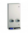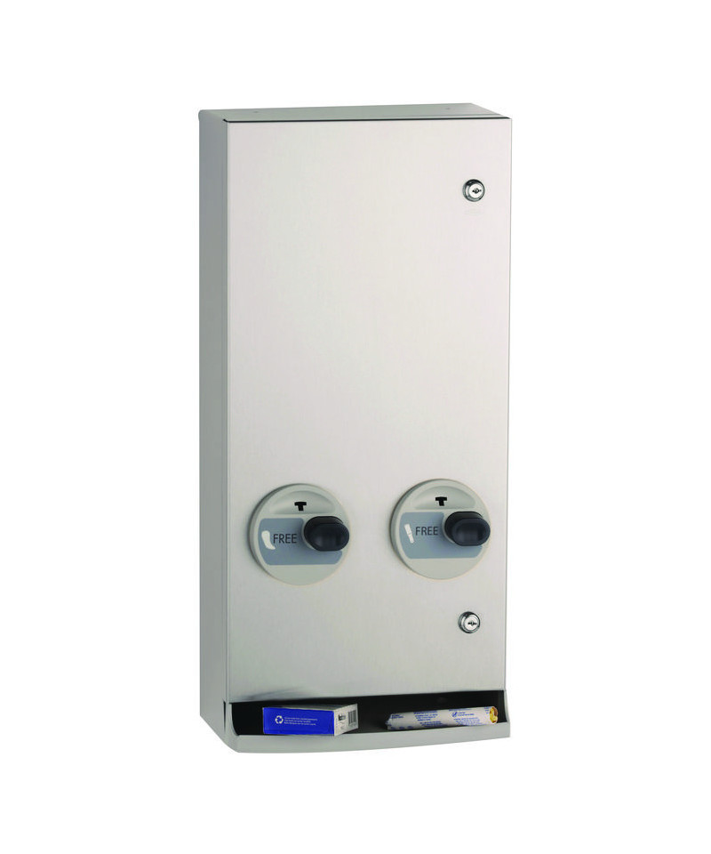 Equipped with stainless steel skirt for surface mounting. Push-button operation requires less than 5 lbs of force; no grasping, pinching or twisting of the wrist. Easy access product tray. Single-coin slots are key to jam-resistant operation. Accepts one or two quarters (U.S. or Canadian). Push-button coin return cancels product selection. Returned coins or wrong coins (1˘, 5˘, 10˘) bypass mechanism and drop into tray. Empty product indicator automatically blocks coin slot. Easy loading, no weights. Two flush tumbler door locks keyed like other Bobrick accessories. Separately-keyed coin box lock for management access. Type 304 satin-finish stainless steel on exposed surfaces.