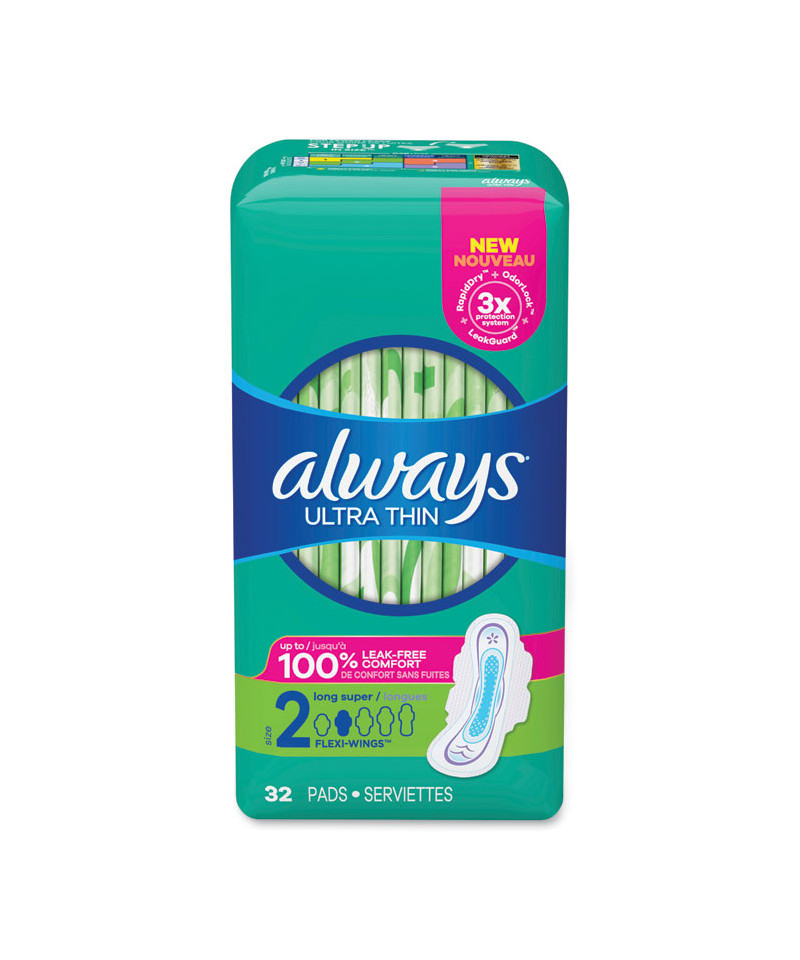 Think all feminine hygiene pads are the same? Think again! These ultra thin pads with flexi-wings are Always' best yet, providing people with periods up to 100% leak-free comfort. They have a flexible sanitary pad design that moves with you. Plus, Always 3x Protection System™ gives you peace of mind day and night. RapidDRY™ absorbs gushes 90% faster than the leading store brand. The LeakGUARD™ core locks in leaks for long-lasting protection. OdorLOCK™ helps prevent unwanted odors to help you feel fresh and clean throughout your day!
