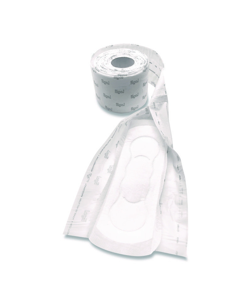 Superthin and comfortable absorbent pads on a roll. Each pad features a perforated edge to make dispensing quick and easy. Top sheet is made of nonwoven ES fiber, the absorbent core is made up of ES fiber, wood fluff pulp and SAP, and the back sheet is PE film. These pads on a roll can be placed in existing toilet paper hardware or in Egal's custom-designed dispenser (sold separately). Egal means equal. Egal believes that pads should be as common as toilet paper. The brand's vision is for pads on a roll to be dispensed in every restroom stall where they are needed most to ensure privacy and dignity for all who menstruate.