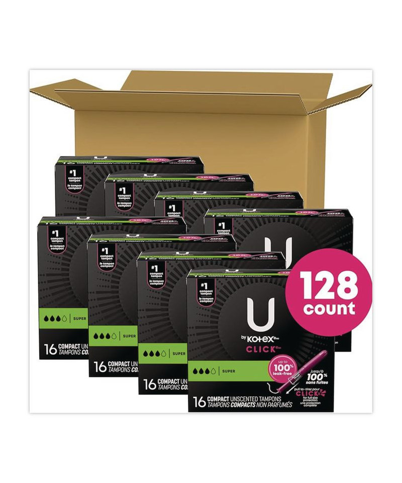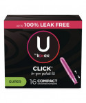 Get full-sized period protection with a comfortable compact tampon! U by Kotex® Click® Tampons allow you to discreetly carry in your purse or pocket. Small in size but big on protection, these tampons go from compact to a full-size tampon in one easy step. Pull the lower half of the tampon until you hear it lock and then insert. Click® Tampons are designed with a smooth tip for comfortable, quick and easy insertion. The tampon expands so you're fully covered to help stop leaks. These unscented tampons are not made with natural rubber latex and have no fragrance added.