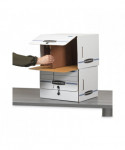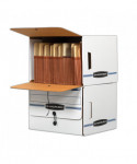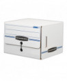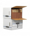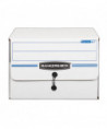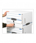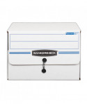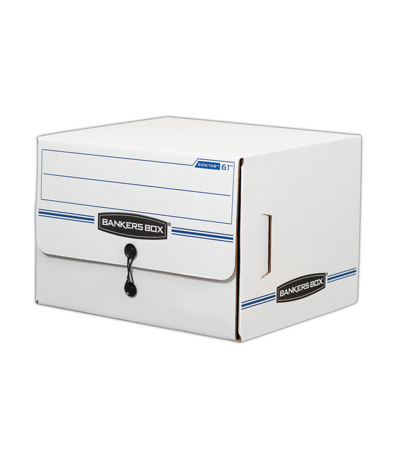 Bankers Box SIDE-TAB Storage Boxes feature a drop-front lid that provides easy access to end-tab patient files and medical records. Designed for shelf storage, these sturdy units stack two high. Center divider holds file folders upright for easy organization. String & button closure keeps files securely stored. Made from corrugated cardboard.