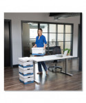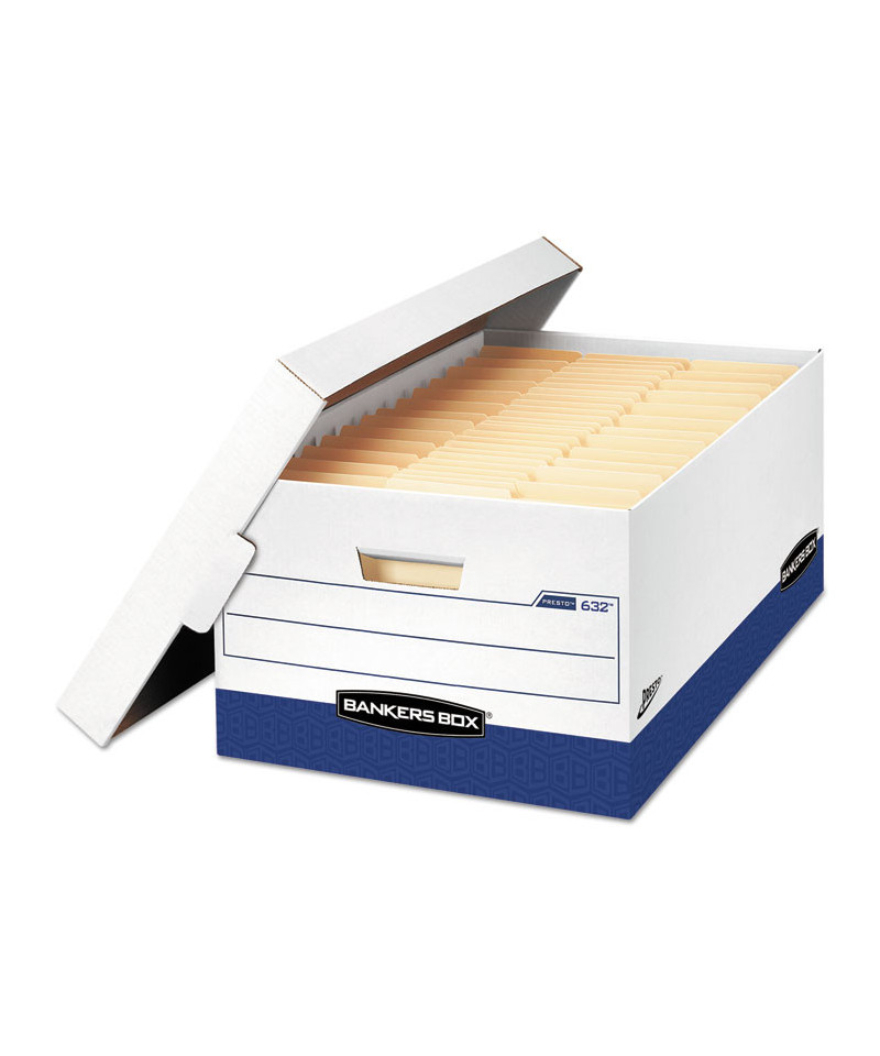 Bankers Box Presto Heavy-Duty Storage Boxes feature instant assembly-just push corners together and the box is ready for use! Heavy-duty, double end, double side, double bottom construction for stacking, storage and transport you can trust. Reinforced, tear-resistant handles make box comfortable to carry. Deep, locking lift-off lid stays in place for secure file storage. Perfect for use in the office or home office, or anywhere you need to store important papers, documents or other items.