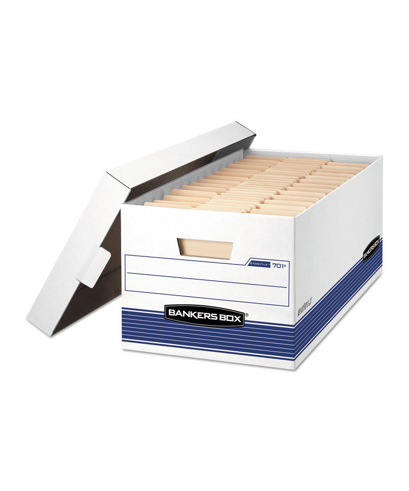 Bankers Box Stor/File Medium-Duty Storage Boxes feature double-end, 1 1/2-side, double-bottom construction. Medium-duty for use with or without shelving. FastFold® quick and easy assembly. Deep, locking lift-off lid stays in place for secure file storage. Rolled edges add strength and prevent paper cuts. Great for storing files, home office items, books, toys, or anything else you want to keep and store. Made from corrugated cardboard.