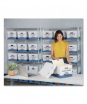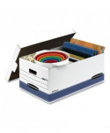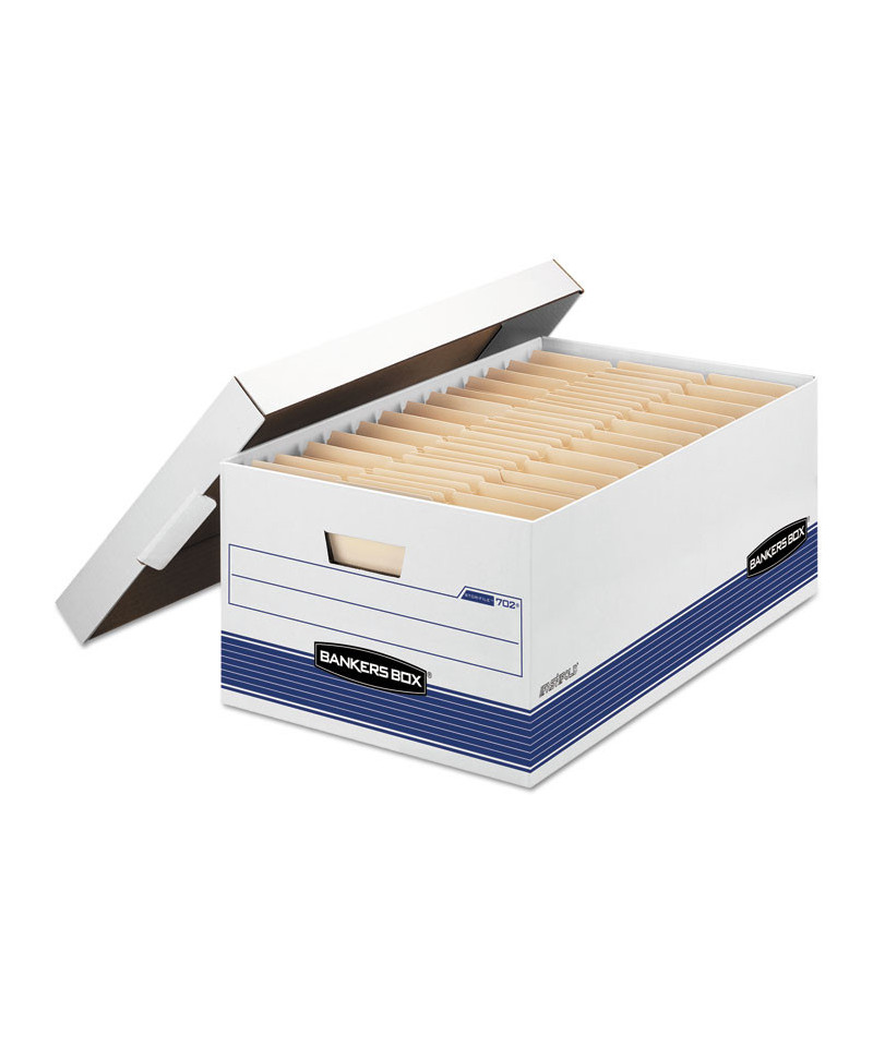 Bankers Box Stor/File Medium-Duty Storage Boxes feature double-end, 1 1/2-side, double-bottom construction. Medium-duty for use with or without shelving. FastFold® quick and easy assembly. Deep, locking lift-off lid stays in place for secure file storage. Rolled edges add strength and prevent paper cuts. Great for storing files, home office items, books, toys, or anything else you want to keep and store. Made from corrugated cardboard.