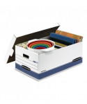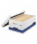 Bankers Box Stor/File Medium-Duty Storage Boxes feature double-end, 1 1/2-side, double-bottom construction. Medium-duty for use with or without shelving. FastFold® quick and easy assembly. Deep, locking lift-off lid stays in place for secure file storage. Rolled edges add strength and prevent paper cuts. Great for storing files, home office items, books, toys, or anything else you want to keep and store. Made from corrugated cardboard.