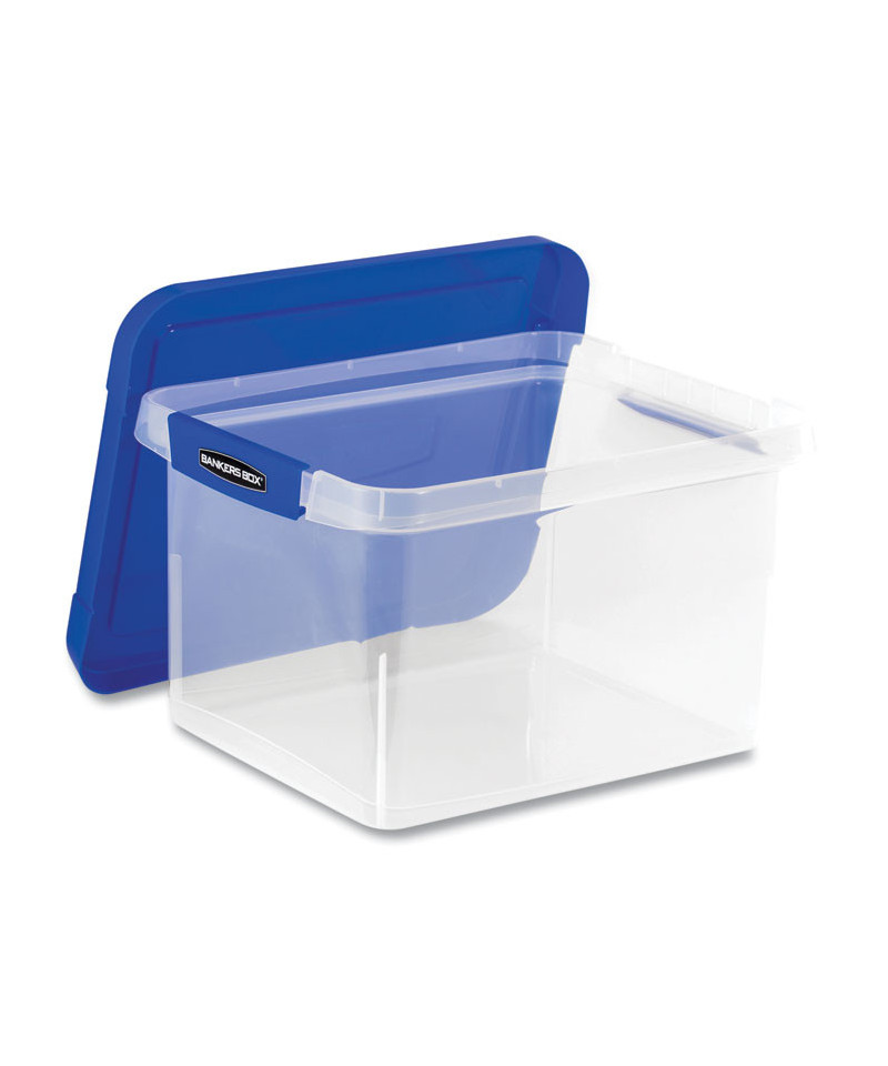 The Bankers Box Heavy Duty Plastic File Storage provides organized and secure storage of documents. Made with durable plastic construction and features reinforced corners for added strength stacks up to five high! Comfortable handles offer easy lifting and the locking lid ensures secure transport. Built-in hanging rail keeps files organized and accessible. The heavy duty plastic file storage box is perfect for office or home office use.