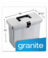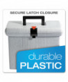 Lightweight plastic hanging file box provides carrying ease; self-locking lid keeps contents secure. Includes three Pendaflex® letter size hanging folders with tabs and blank inserts. Recessed handle folds down for storage.