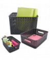 Attractive black baskets with woven design will get your workspace organized. Great for storing all sorts of items including CDs, DVDs, office supplies and more. Sturdy plastic construction. Comes in a multi-pack with one small, one medium, and one large.