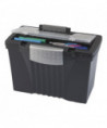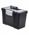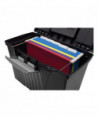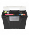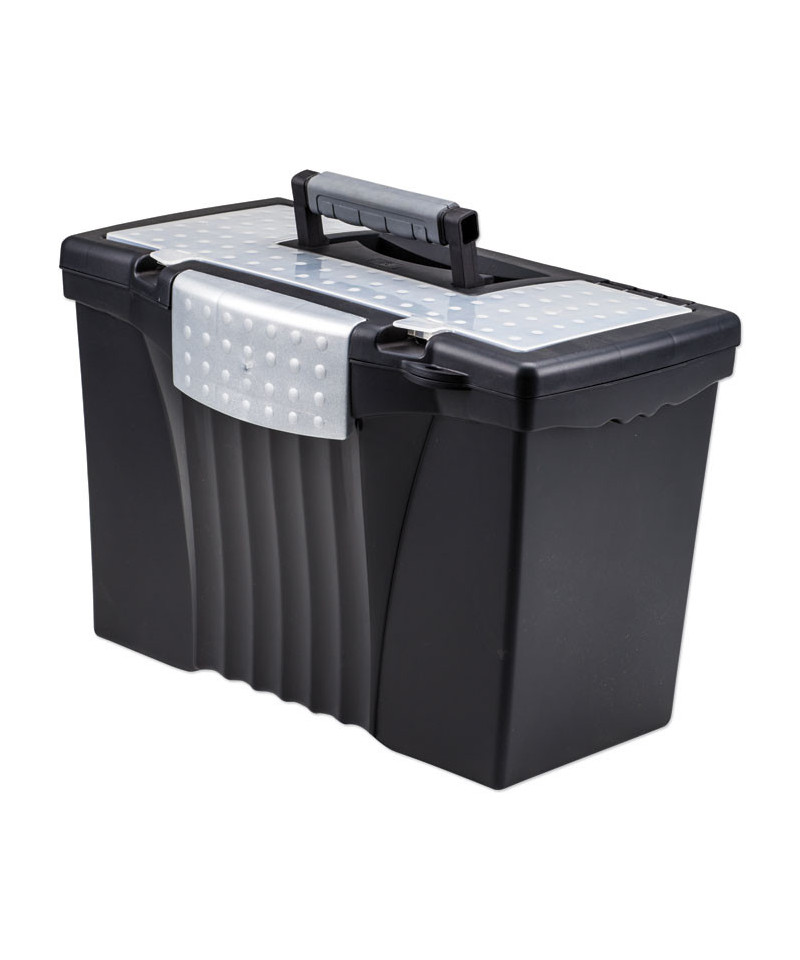 Organizer compartment in lid allows for easy access to supplies. Handle and latch allow for ease of transporting files from car to office or from room to room. Latch accepts padlock (not included). Holds letter or legal files.