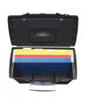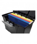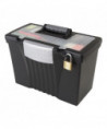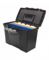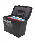 Organizer compartment in lid for supplies. Handle and latch for easy, secure transport. Latch accepts padlock (not included). Holds letter or legal files.