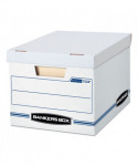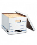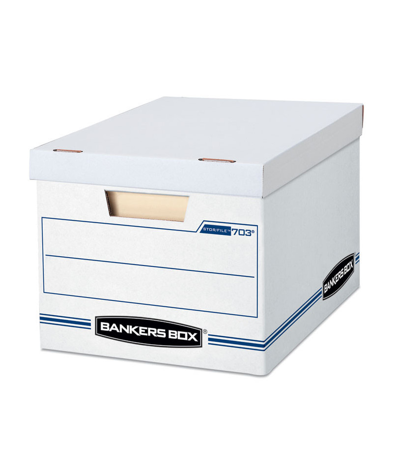 Bankers Box Store/File Basic Duty Storage Boxes feature double-end, single-side construction. Lift-off lid ships attached to prevent lid loss, then tears off for use. Light-duty, basic set-up construction for moderate stacking or use with shelving. Lift-off lid that stays attached until ready to use. Great for storing important papers, home and office items that you want to store away for future use. Made from corrugated cardboard.