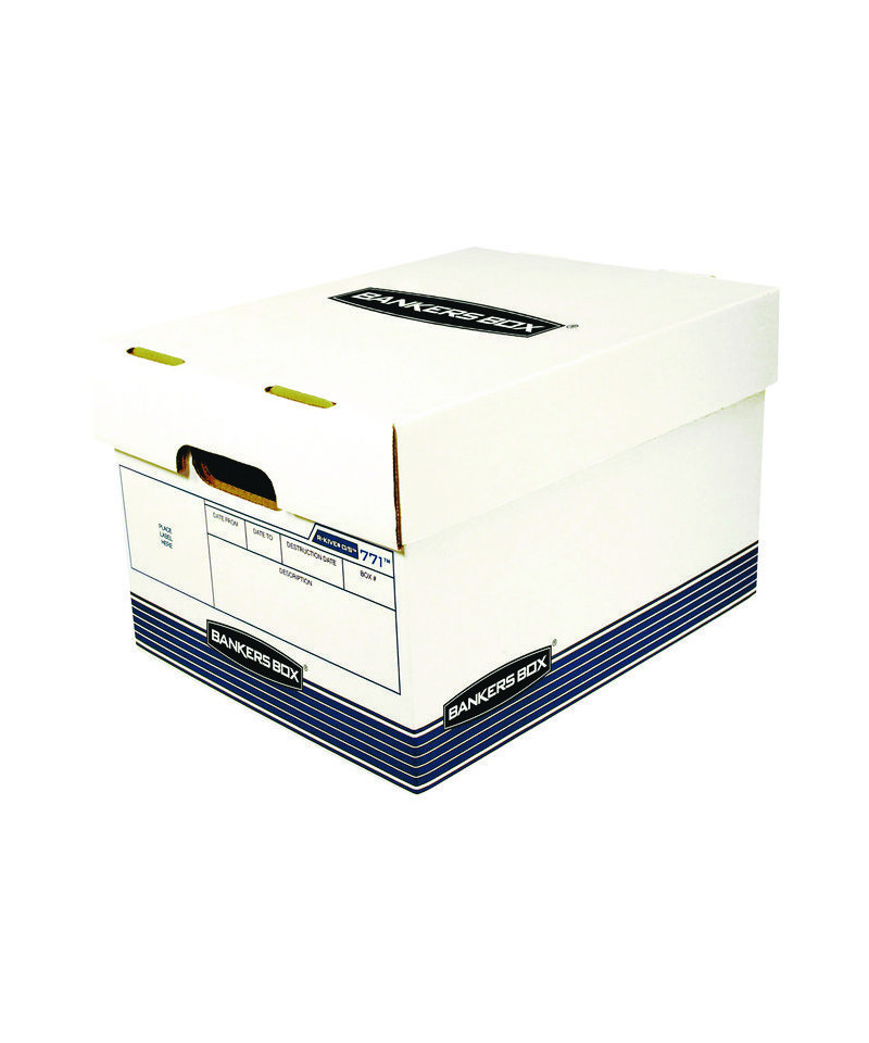 Heavy-duty, triple-end, double-side, double-bottom construction stacks up stronger and withstands frequent handling. FastFold® quick and easy assembly. Reinforced tear-resistant handles make box comfortable to carry. Deep, locking, lift-off lid stays in place for secure file storage. Smooth rolled edges add strength and prevent paper cuts. Great for storing home or office papers, and other documents, along with a variety of materials and items that you need to store for safe keeping.