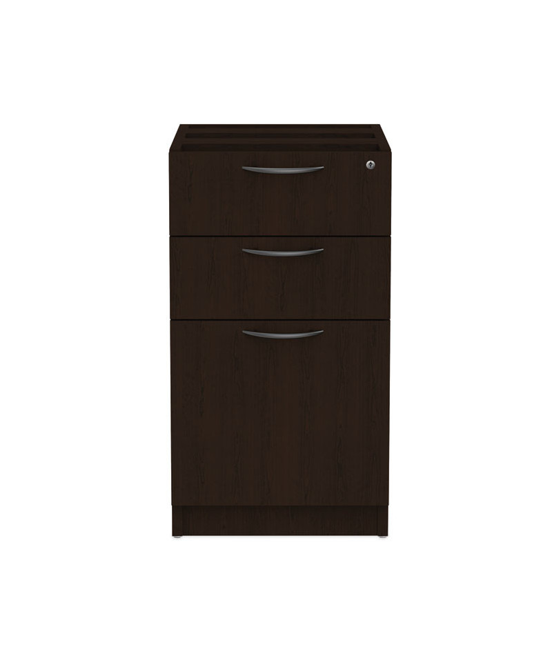 Pedestal file cabinet attaches under worksurface. Sturdy, four-sided drawer construction with separate front panel. Full-extension ball-bearing slides on file drawer. Drawers lock for securing contents. Durable 3 mm edge banding protects against bumps and dings. Two, fold-away safety keys for a slimmer profile are included.