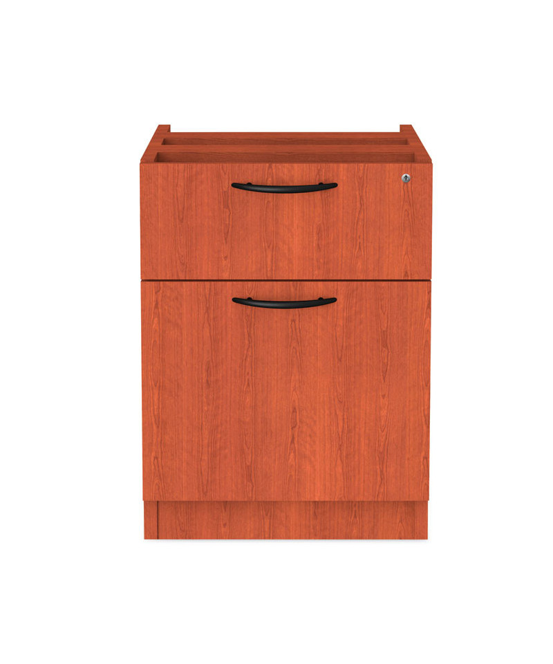Pedestal file cabinet attaches under worksurface. Sturdy, four-sided drawer construction with separate front panel. Full-extension ball bearing slides on file drawer for easy access to files. Drawers lock for securing contents. Two, fold-away safety keys for a slimmer profile are included.