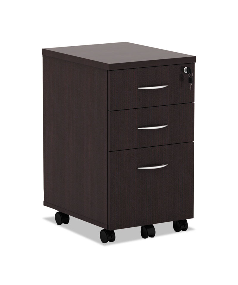 Mobile file cabinet is ready to go anywhere you need it to go. Full-extension ball bearing slides on file drawer for easy access to files. The drawers lock for securing contents. Durable 3 mm edge banding protects against bumps and dings. Five casters, two locking. Center caster prevents tipping. Fully assembled, just attach casters. Two, fold-away keys which provide a slimmer profile are included.