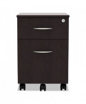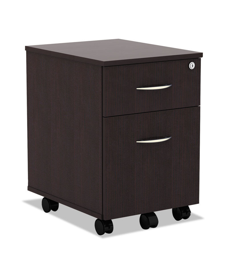 Sturdy woodgrain laminate mobile box file pedestal to store all your office necessities. Full-extension ball bearing slides on file drawer for easy access. Durable laminate is water-, scratch-, and dent-resistant with 3 mm protective edge banding. Two fold-away safety keys included. Accepts Alera® Pedestal Cushions for an instant seating option.