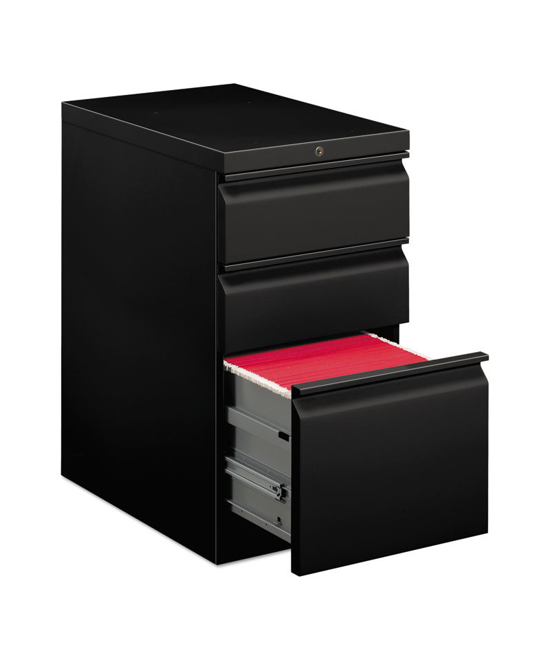 Heavy-duty pedestals with radius pulls to complement Brigade® 800 Series Lateral Files. High sides for front-to-back letter size filing. Ball bearing suspensions on file drawer (90% extension) and box drawer (75%) extension. HON® "One Key" interchangeable lock core. Counterweight inhibits tipping when opening more than one drawer. Fixed front casters; swivel back casters. Fits under 29 1/2" high worksurfaces.
