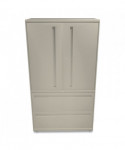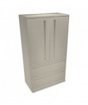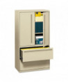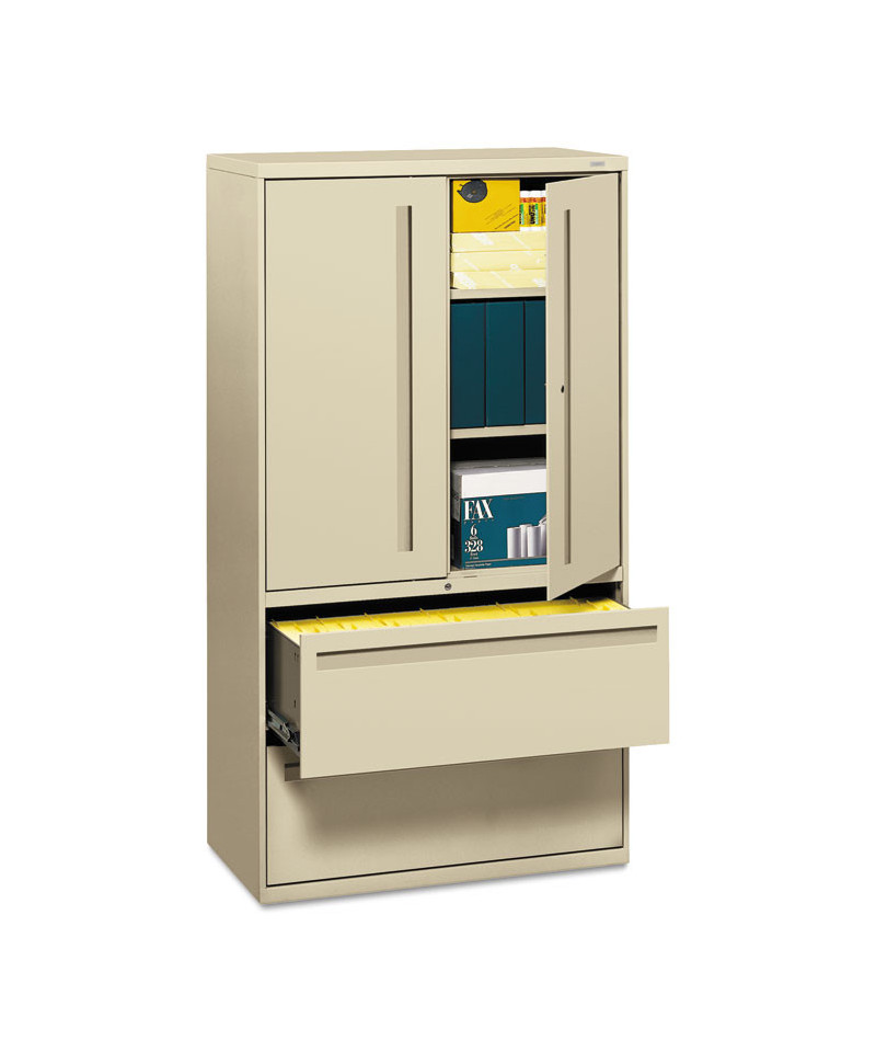 Hinged doors conceal 36 1/4" storage space with two adjustable shelves. Bottom shelves hold two rows of three-ring binders. Two lateral file drawers with steel bearing suspension for letter/legal size filing. Keyed alike locks secure doors and lateral file drawers independently.