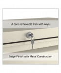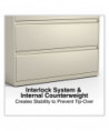 Drawers with side-to-side hang rails to accommodate letter/legal hanging files. Full drawer extension on steel ball bearing telescoping slide suspension helps drawers glide with ease. Stylish, full-width radius edge recessed pulls help to quickly open and close drawers. Anti-tipping interlock system allows only one drawer to open at a time. Single key core removable lock with two keys. Four adjustable leveling glides. Durable powder coated finish helps prevent scratches.