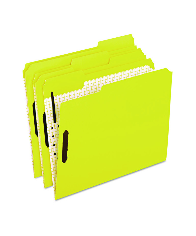 Secure key documents with 2" capacity prong fasteners embossed into front and back covers. Super thin Lesspace® fasteners take up less room in your file cabinet; smooth back prevents fasteners from catching onto loose papers or other folders. Interior grid for convenient note-taking. Long-wearing double-reinforced tops. 11 pt. stock.